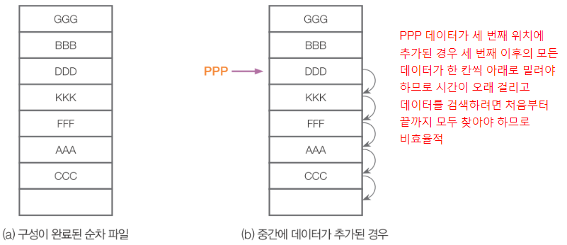 순차파일은 내용을 순서에 따라 연속해서 저장하는 것으로 구조가 간단하기에 저장되는 공간 효율이 높지만