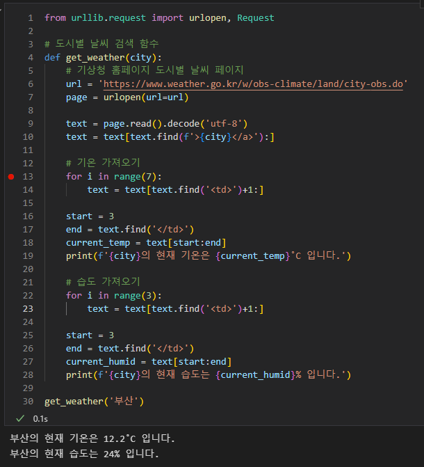 | Python 공부정리 - 웹크롤링 - 기상청 정보 가져오기 (0) | 2023.02.08 |