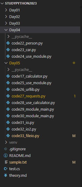 최상위 폴더는 STUDYPYTHON2023이고 그 안에 Day01, Day02, Day03, Day04, Day05 폴더가 있으며