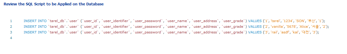 눈치가 빠른사람들은 창에 뜬 CREATE SCHEMA 'tarel_db'; 가 쿼리문이라는 것을 알것이다.